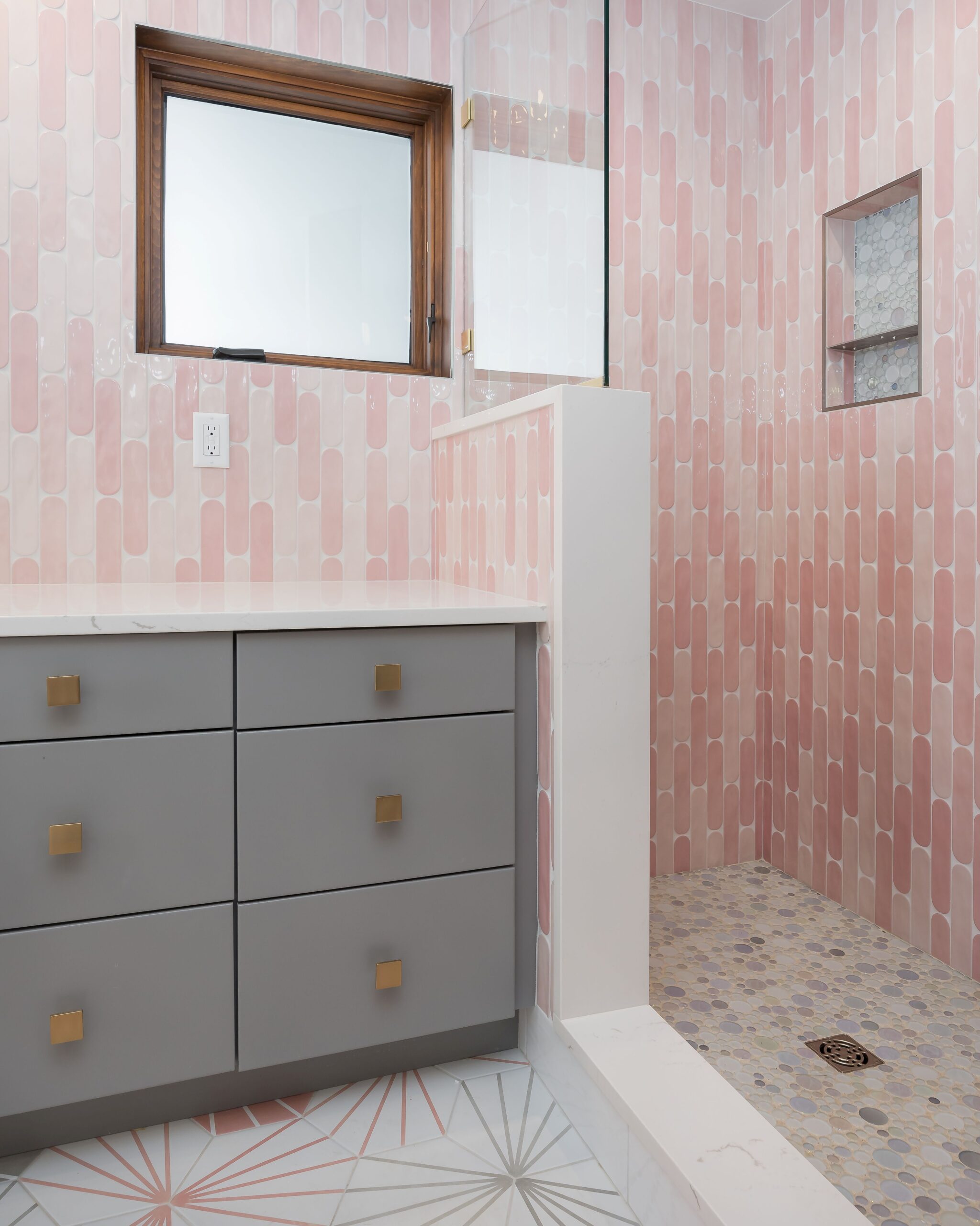 The kitchen features painted cabinetry from Bridgewood Cabinetry in their Gale Force and Boulder finishes, styled with the Tescott door. An art deco–inspired backsplash adds a unique touch that reflects the homeowners’ design style.